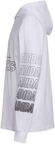 This boys’ long sleeve hooded t-shirt says “adidas” with bold graphics down the sleeves and on the chest. It’s made of all-cotton jersey that’s soft and easy to wear. This hoodie tee can be worn alone or layered under a sweatshirt.