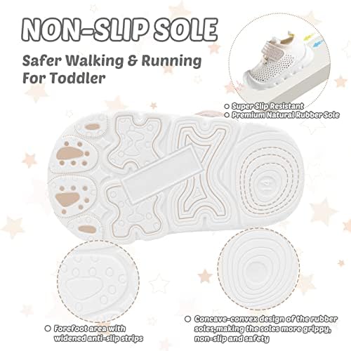 Breathable Upper: The upper of these toddler walking shoes is made of breathable mesh material that absorbs sweat quickly, and the mesh extends all the way to the top of the shoe, making it more breathable and quick-drying, keeping your baby fresh and breathable all day long.The cozy soft lining keeps baby feeling soft even without socks.The mesh surface of the toddler running shoes is easy to clean and dry, and if it gets dirty, it can be thrown in the washing machine without any problems.