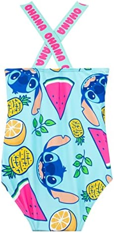 Get ready to make a splash in this Lilo and Stitch swimsuit, featuring an all-over tropical print of juicy fruits and everyone’s favourite alien mischief-maker, Stitch! With its vibrant colours and playful pattern, this swimsuit is perfect for beach days, pool parties, or just lounging around in the sun. And to top it all off, the strap proudly declares “Ohana” in bright pink font, reminding you that family means nobody gets left behind – not even your favourite swimwear! But that’s not all – this swimsuit also comes with a matching blue scrunchie, so you can tie up your hair in style and keep it out of your face while you’re splashing around.