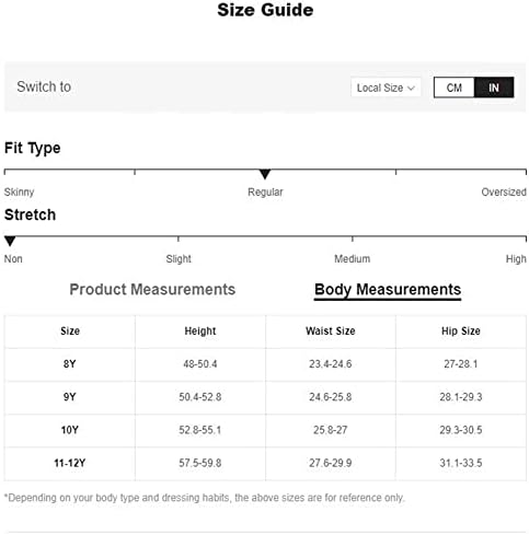 8-9 Years: Length: 31.5″, Waist Size: 24.0″, Hip Size: 33.1″, Thigh: 19.8″