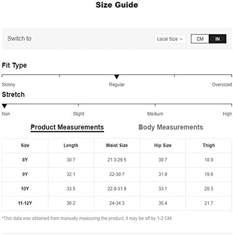 10-11 Years: Length: 33.9″, Waist Size: 25.6″, Hip Size: 34.6″, Thigh: 20.7″