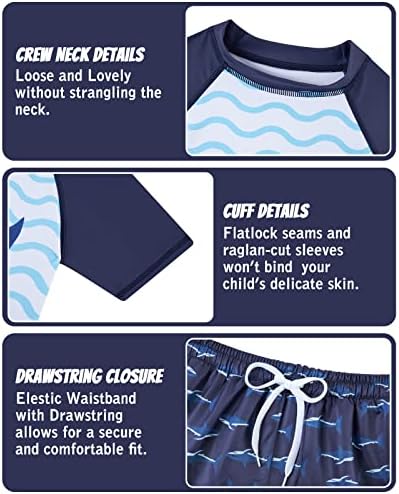 Function: Skin friendly fabric of this rash guard swimsuit set is perfect for your boy’s delicate skin,UPF 50+ Material for UVB and UVA protection;Elastic waist for better fit;Drawstring closure;4 way stretch fabric for comfort;Mesh-lined swim shorts